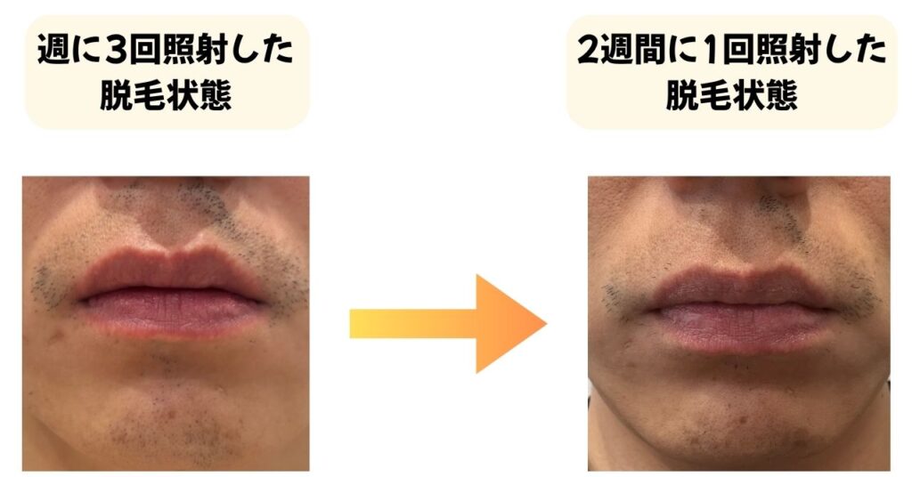 上記の写真は半年間、週に3回照射を継続していた時と2週間に1回照射した時の